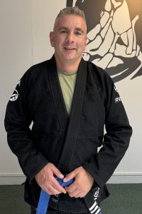 Justin holds a 4th Degree Blue Belt in Brazilian Jiu-Jitsu under Professor Rebecca Blair at Gracie Allegiance and has trained in ground fighting and mixed martial arts for over two decades. His extensive martial arts background includes a 2nd Degree Black Belt in Haidong Gumdo (Korean sword martial art), a Black Belt in Khochi-Kali Kar, and cross-training in Aikido, Judo, Krav Maga, and Kickboxing, with competitive kickboxing experience.